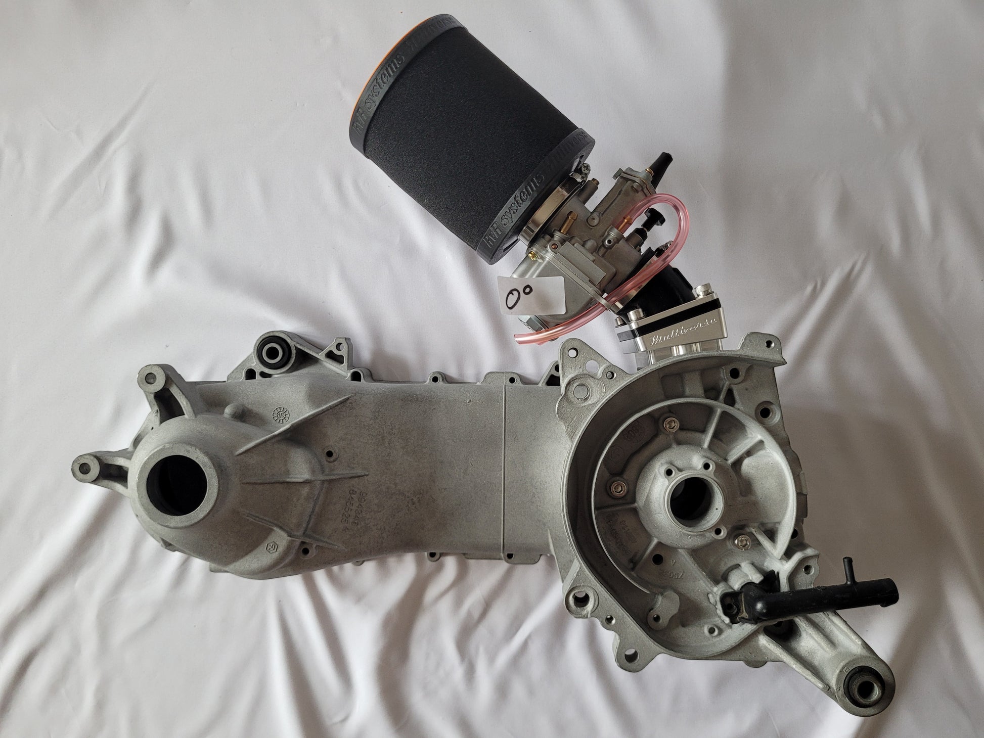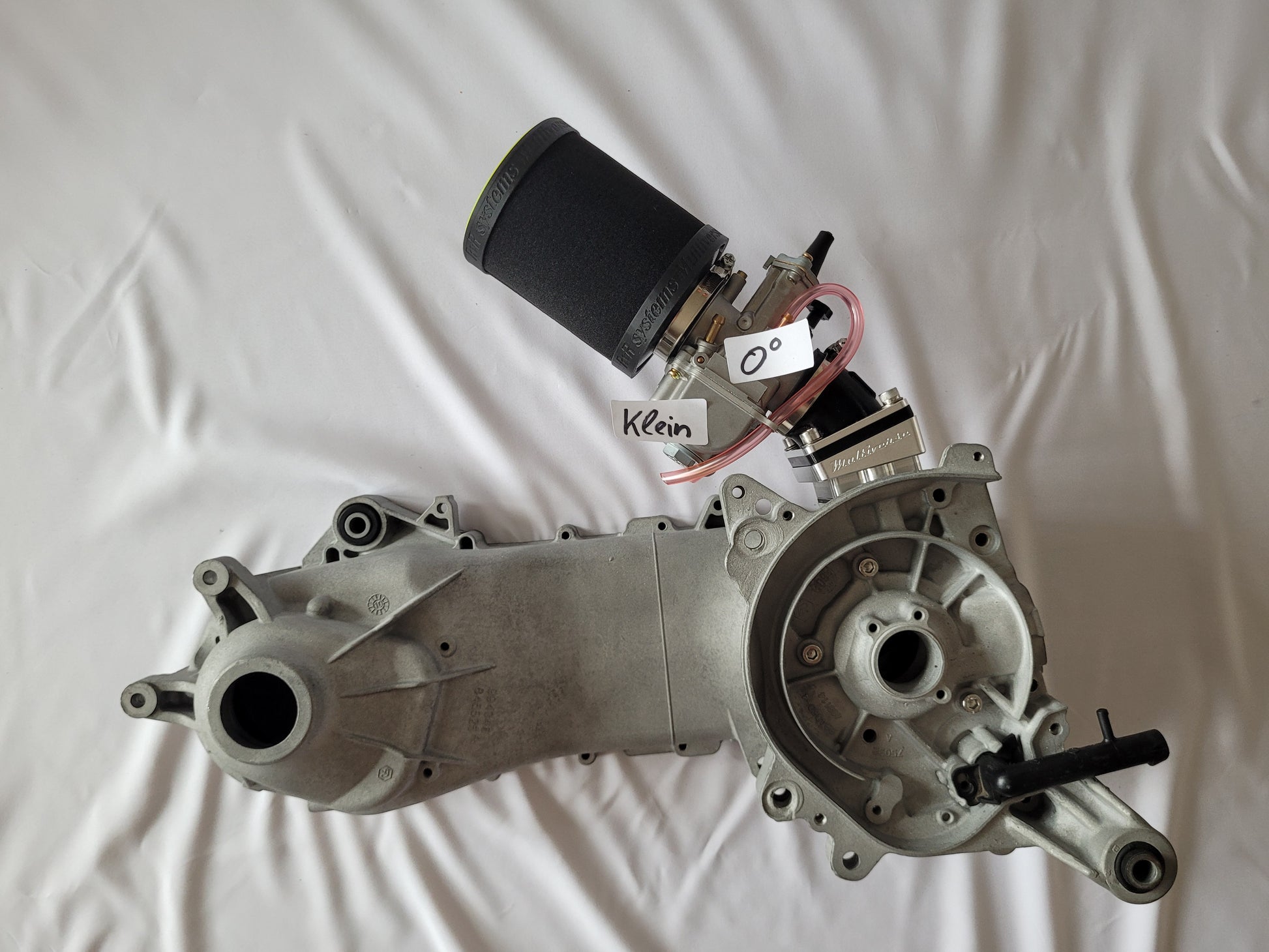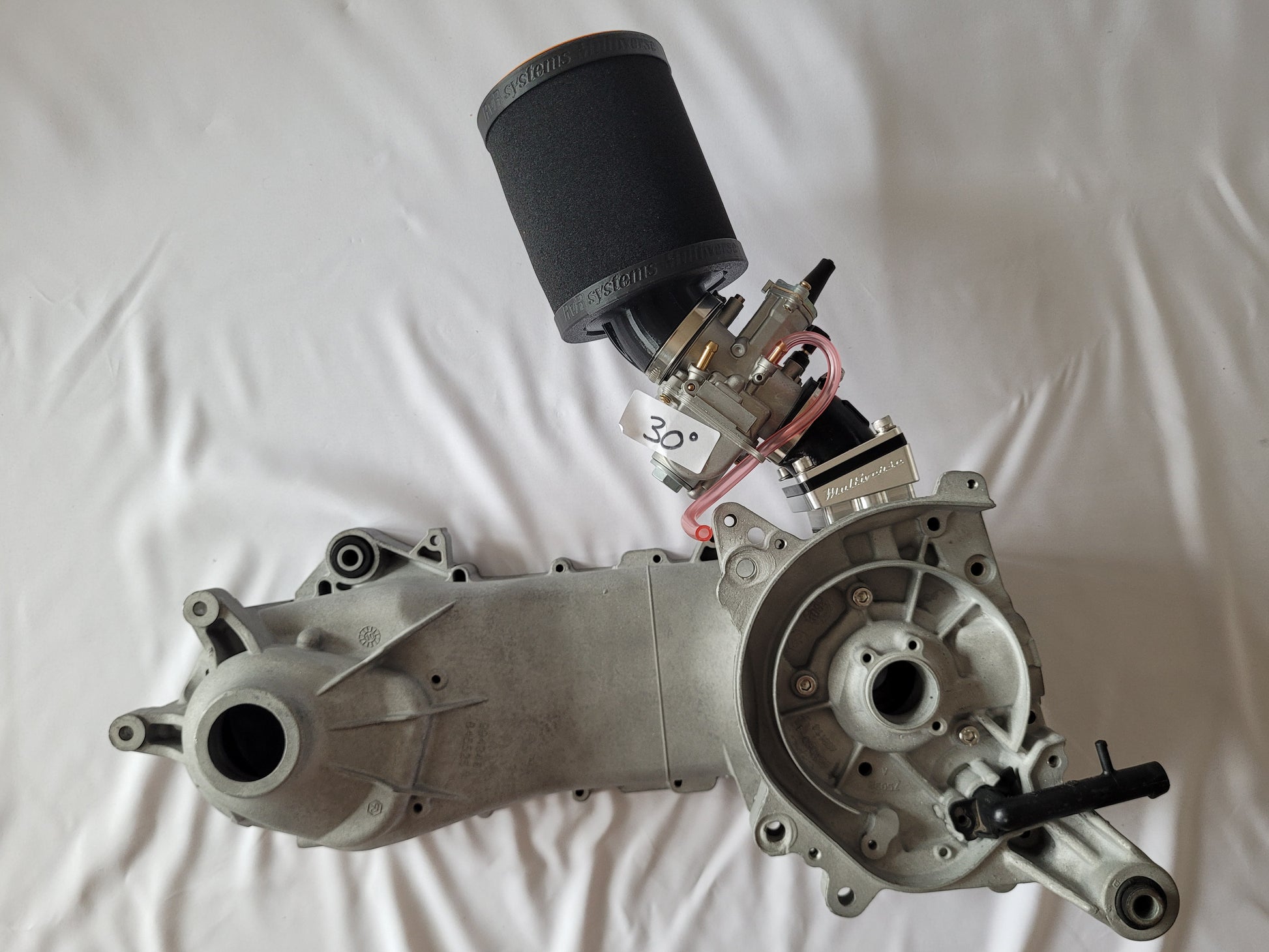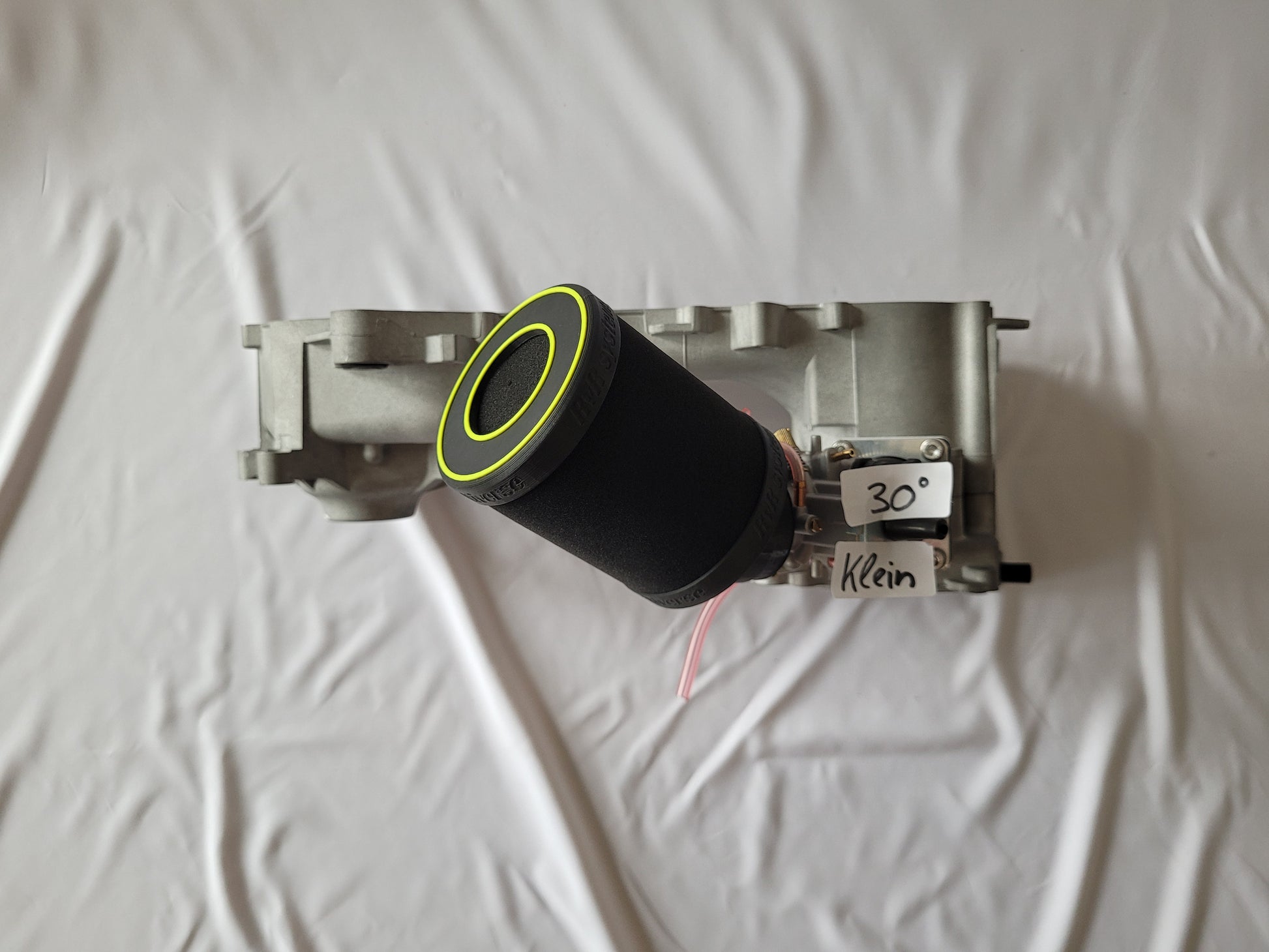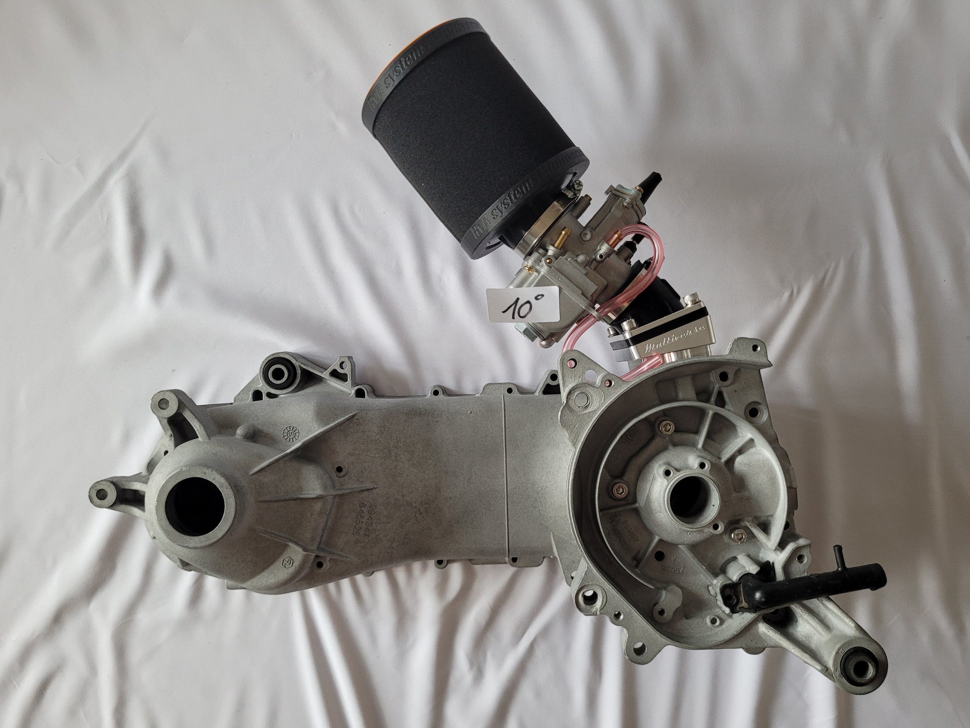 Verschiedenste Winkel am Anschluss lassen den Luftfilter nach oben, unten oder links, rechts geneigt montieren, jenachdem wie man Grundkörper und Anschluss montiert. (Siehe diverse nach oben geneigte Beispiel Bilder am Piaggio Motorblock Modell).