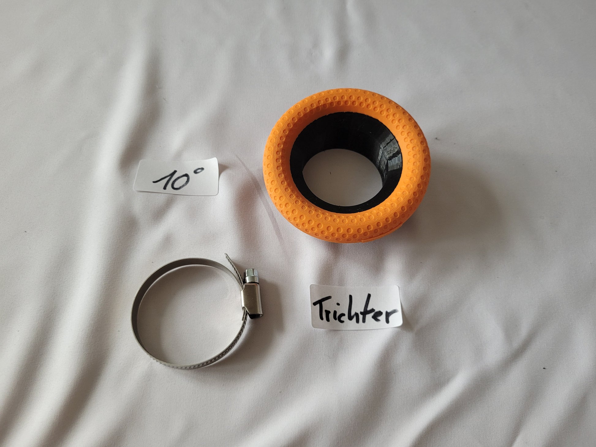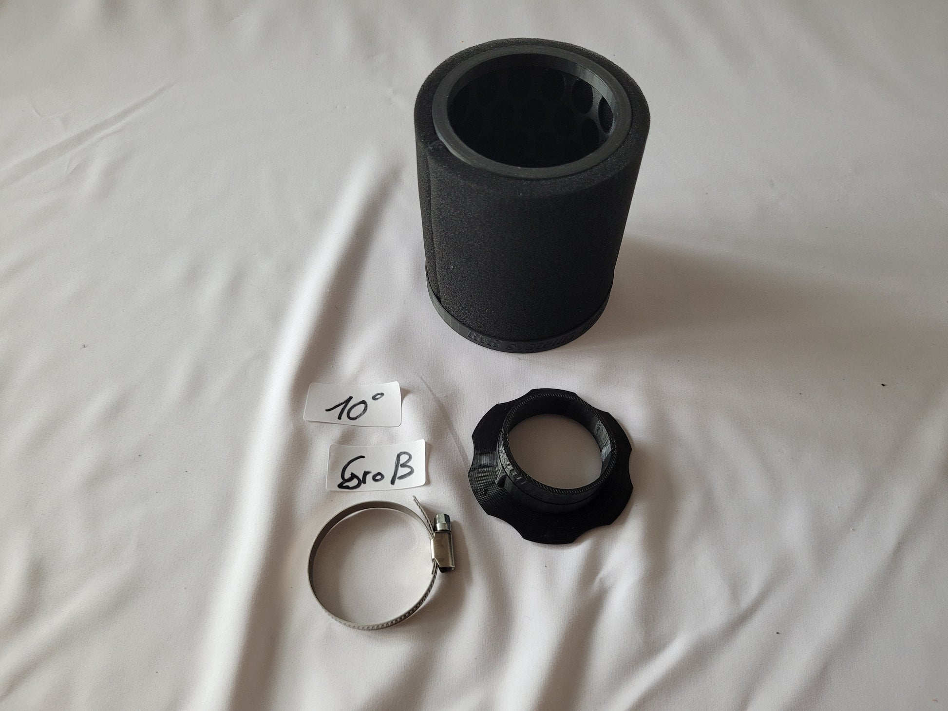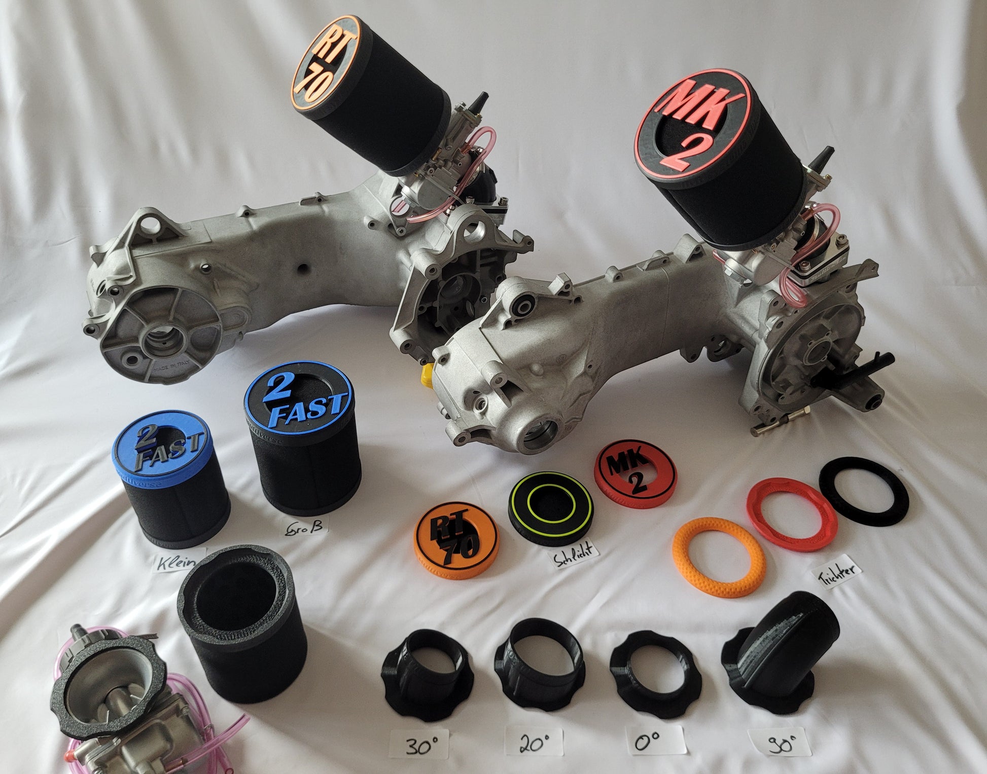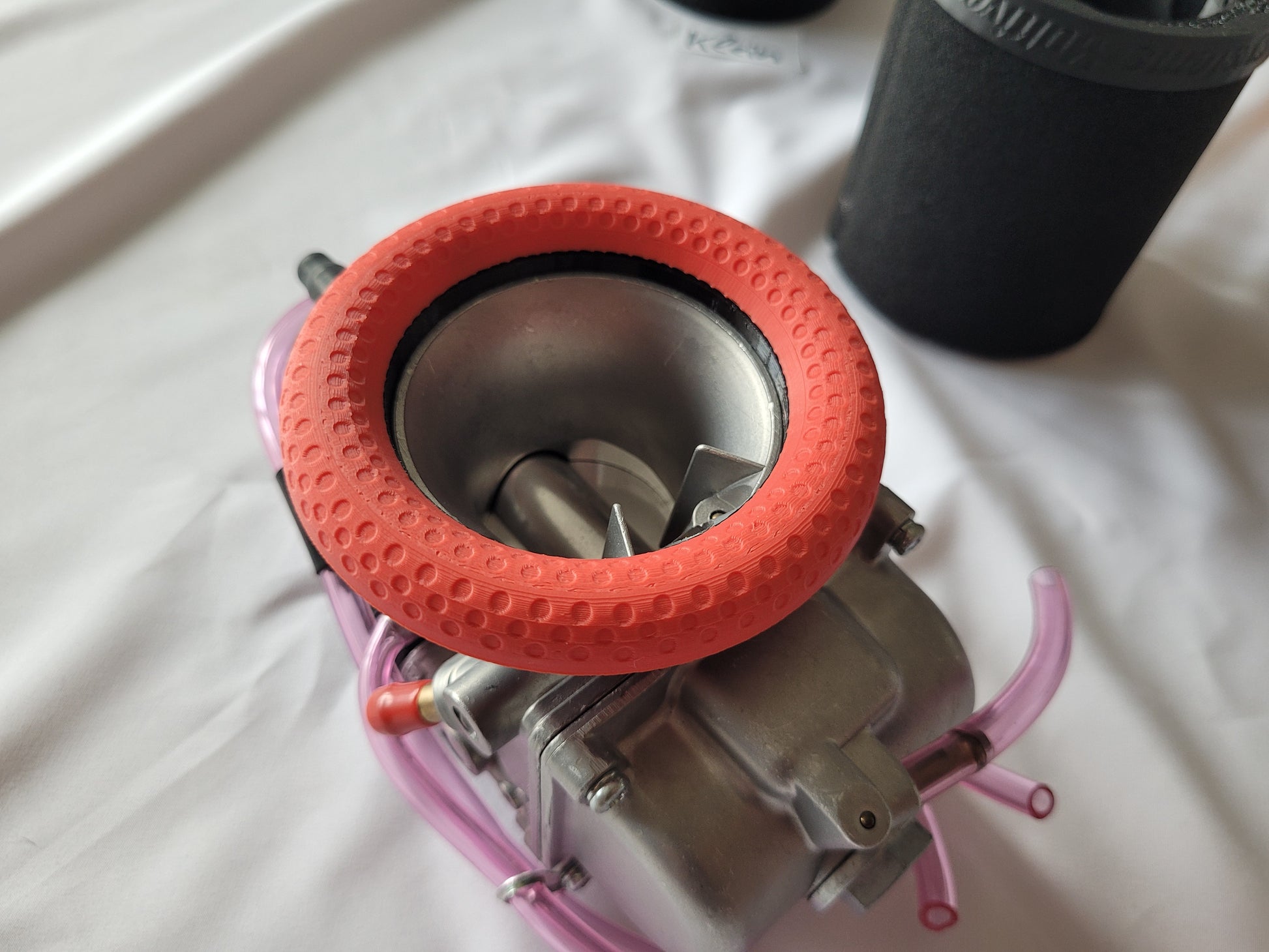 - Vergaser-Anschluss (TPU flexibel) mit eingelassenen Magneten und Verdrehverschluss. Passt auf beide Luftfilter Varianten und auch auf den Trichter! (1Anschluss für 3 Varianten)