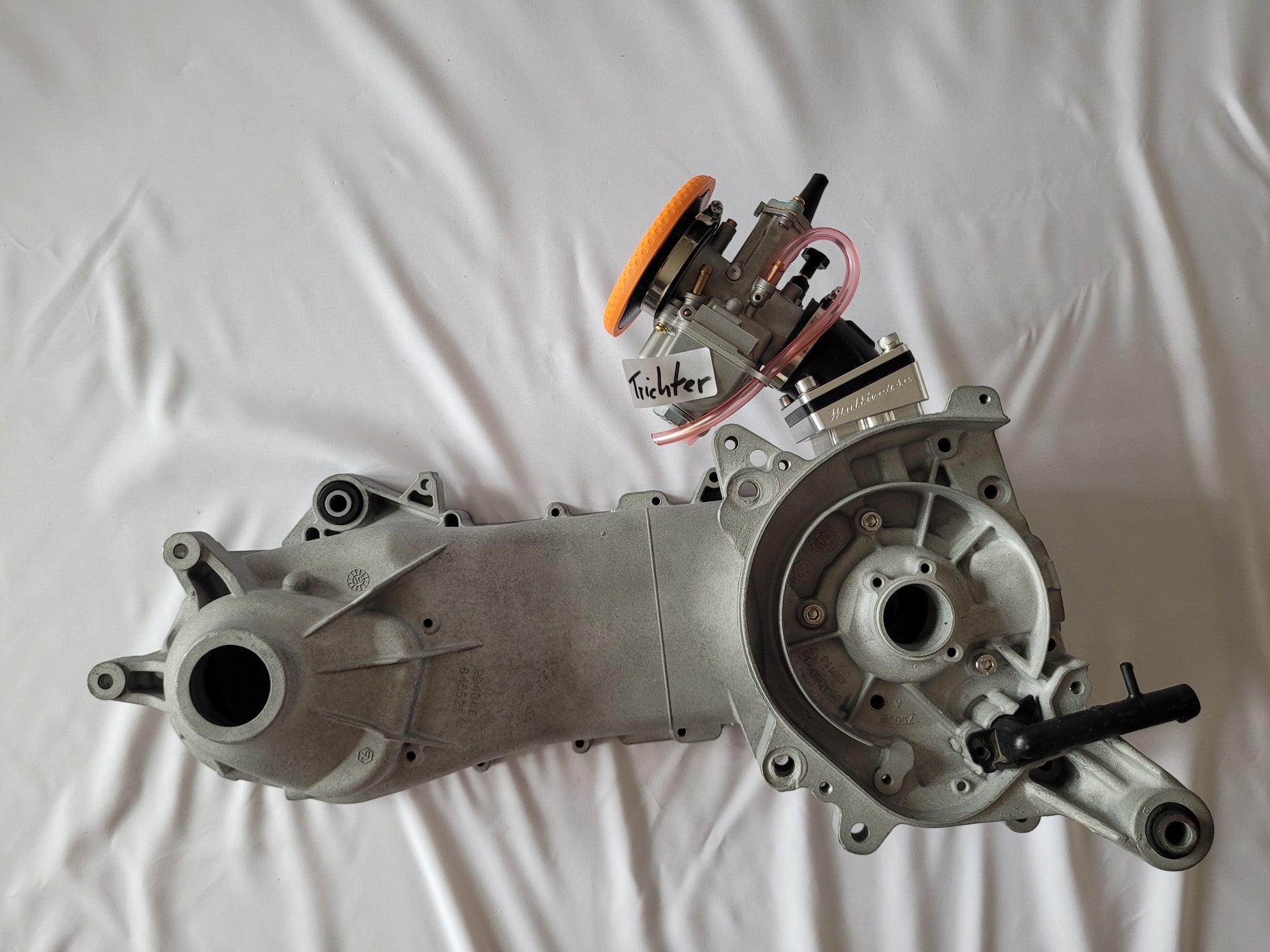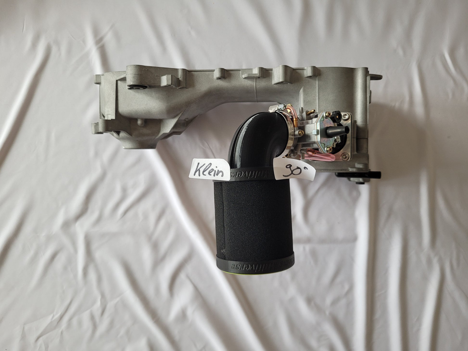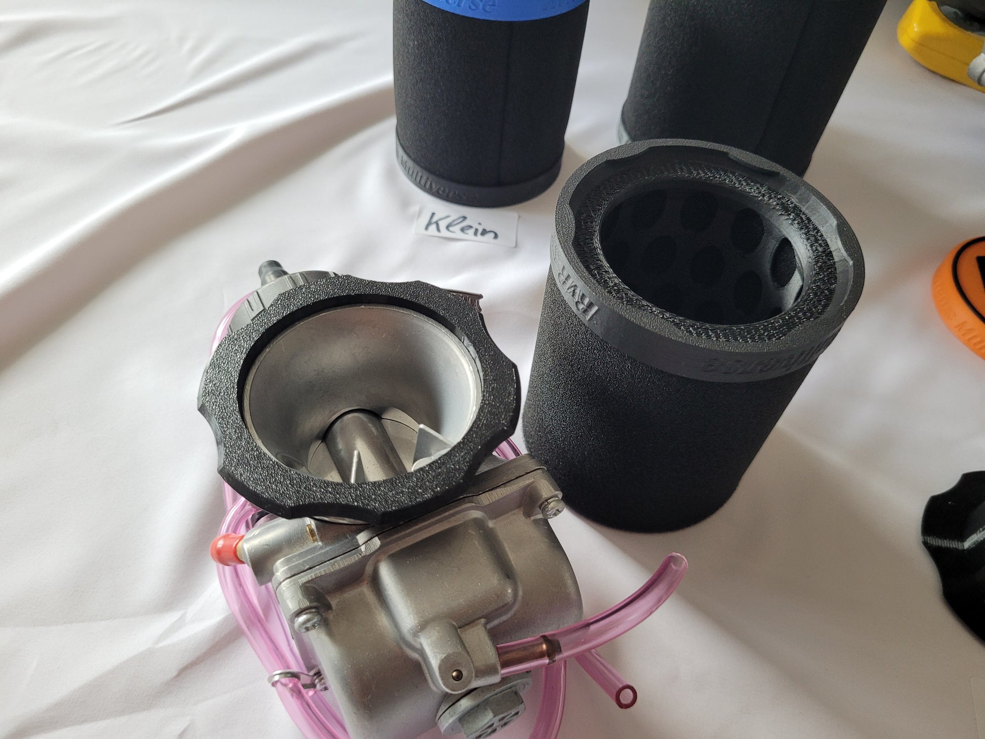 - Vergaser-Anschluss (TPU flexibel) mit eingelassenen Magneten und Verdrehverschluss. Passt auf beide Luftfilter Varianten und auch auf den Trichter! (1Anschluss für 3 Varianten)